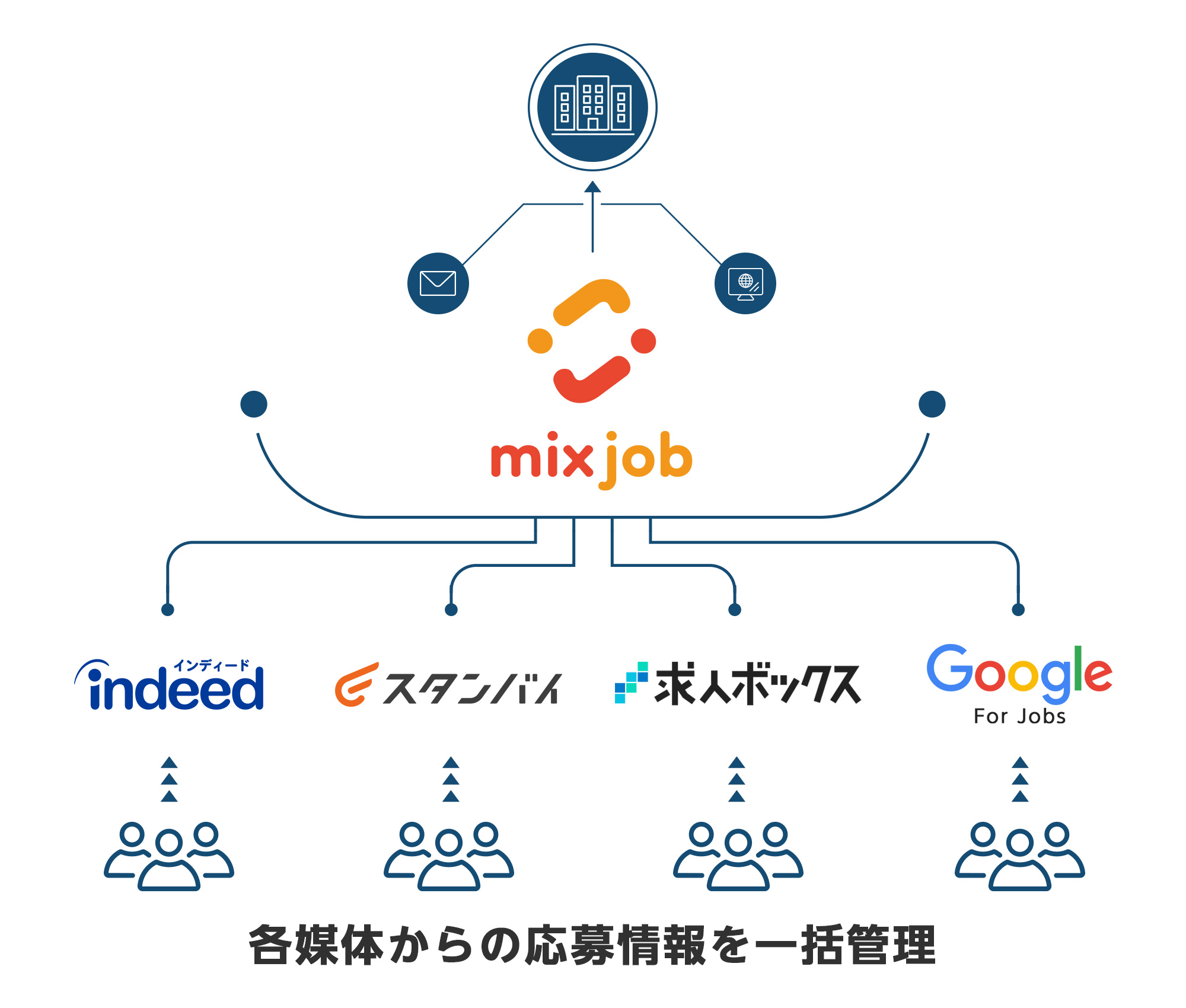 企業様の代わりに、複数の求人メディアに情報を配信し、応募者データを一元的に管理します。